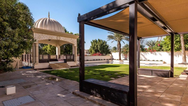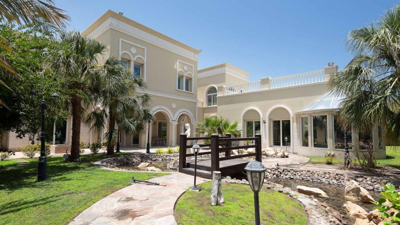 Overlooking the lush green fairways of the Montgomerie Golf Course is this stunning six bedroom luxury property. From its quiet location, residents can feel surrounded by beautiful landscapes in the secluded and exclusive neighbourhood of Emirates Hills. The villa itself has been fully upgraded including across both the show and service kitchens that are fitted with high-end appliances. The interior of the villa is spacious and inviting with a stylish entrance hall, multiple reception areas and a private study. The ground floor has a guest bedroom with en-suite bathrooms, en-suite driver’s and maid’s rooms and a lift that accesses all the floors. On the first floor there is an atrium-style view of the entrance, five bedrooms with en-suite bathrooms and a grand master bedroom suite with its own en-suite and private balcony that overlooks the garden, pool and golf course. Outside, the exterior of the villa, which all overlooks the golf course, includes a well-planned and landscaped garden that is ideal for entertaining and comes with its own gazebo, covered seating areas and a large L-shaped private swimming pool. At the front of the villa there is ample parking and a garage that can accommodate four cars.